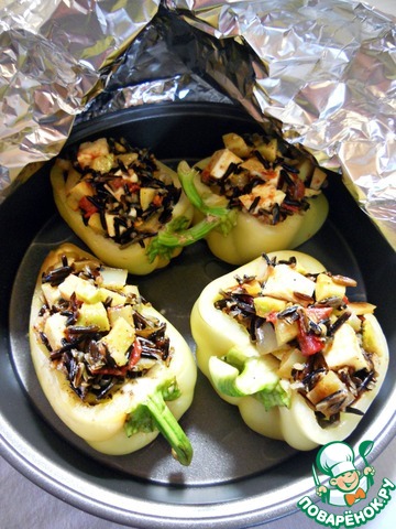 Смешайте тушеные овощи с сыром и рисом. Нафаршируйте смесью половинки перца.