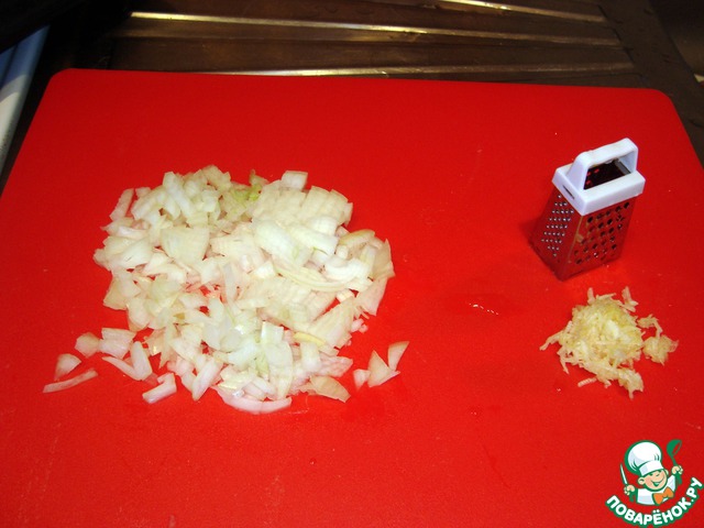 3. Шинкуем лучок, мелко трем чесночёк (это у меня такая маленькая тёрка, подойдёт и обычная).