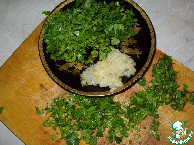 Петрушку помыть и мелко нарезать. Чеснок выдавить через чеснокодавку.