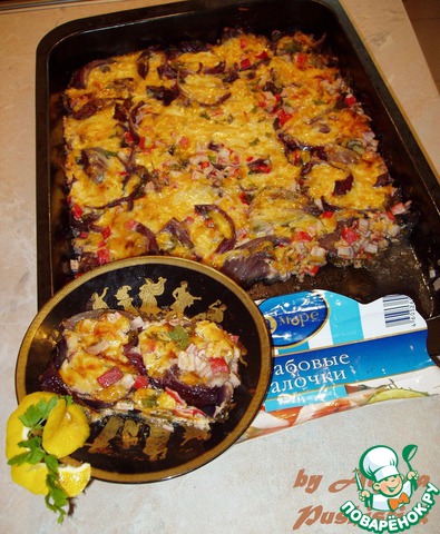 | Необычайная Запеканочка с крабовыми палочками и красным луком. Очень яркая и необычная. Обладает пикантным вкусом и ароматным запахом, а красный лук придает ей особую сластинку. В общем, мой эксперимент удался на славу!!! Попробуйте! И Вы не пожалеете. |