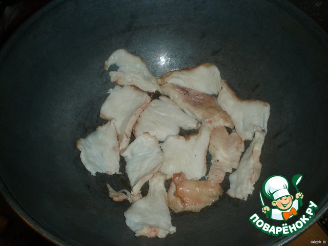 Режем курдюк на большие,нетонкие куски.Потом из них получатся НАИВКУСНЕЙШИЕ выжерки,которые мы подадим с блюдом.
