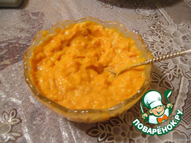 Делаем соус. Курагу прокрутить в блендере и смешать со сливками.