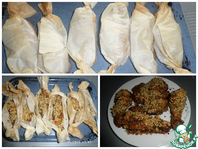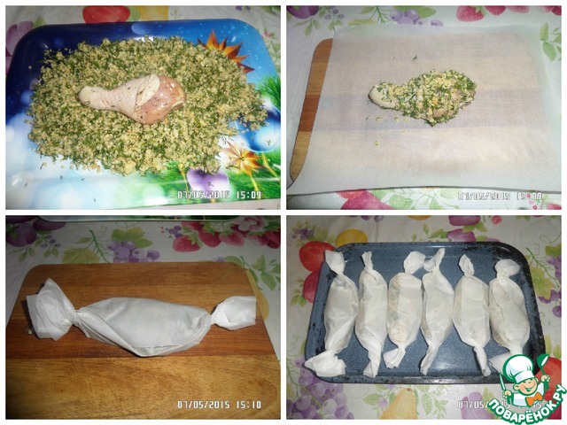 Высыпаем нашу смесь на небольшой поднос, кладем куриную голень и обваливаем со всех сторон в панировке. Нарезаем прямоугольниками пергамент. Выкладываем куриные ножки на пергамент, заворачиваем. Выкладываем на противень.