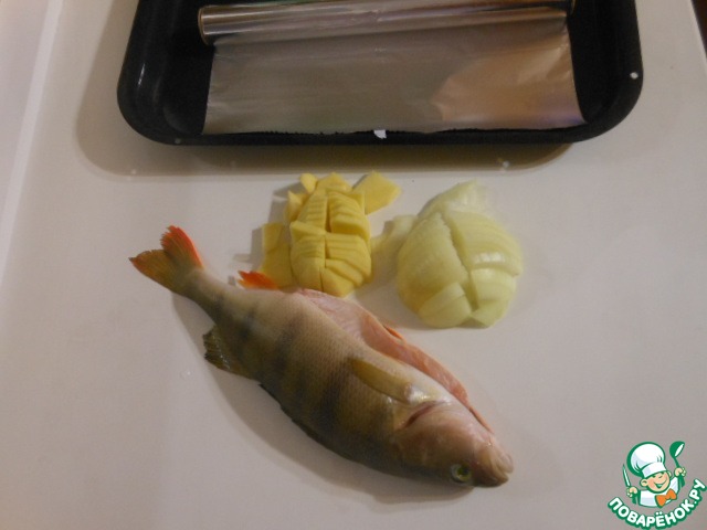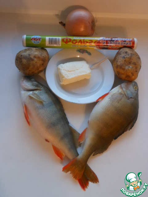 Для приготовления берём два окуня грамм по 450 – 500, одна луковица 250 грамм, две средних картофелины, 100 грамм сливочного масла, соль, перец.