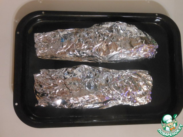 Заворачиваем всё вторым слоем фольги и укладываем на противень