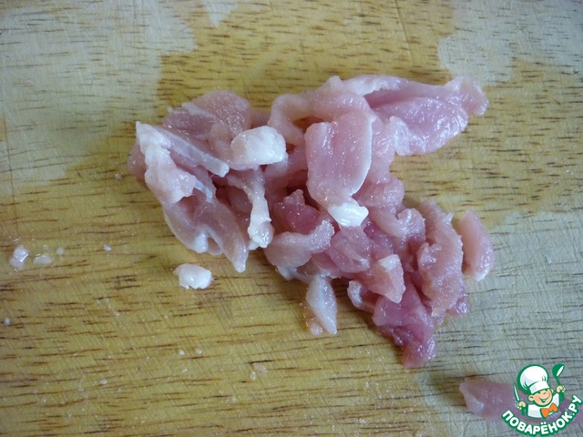 Очень тонко нарезать свинину, длиной 2-3 сантиметра.