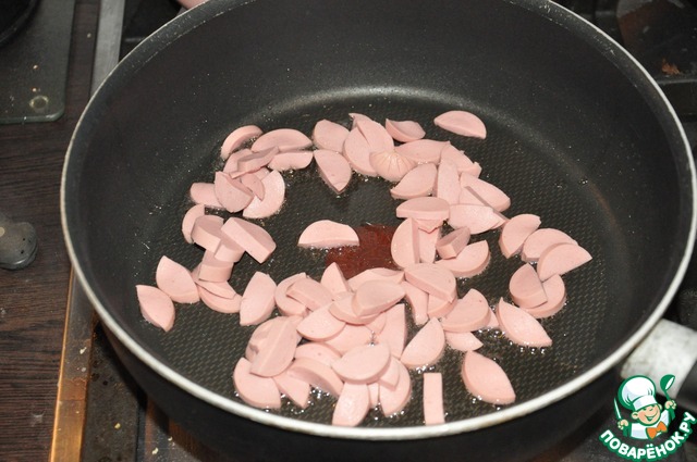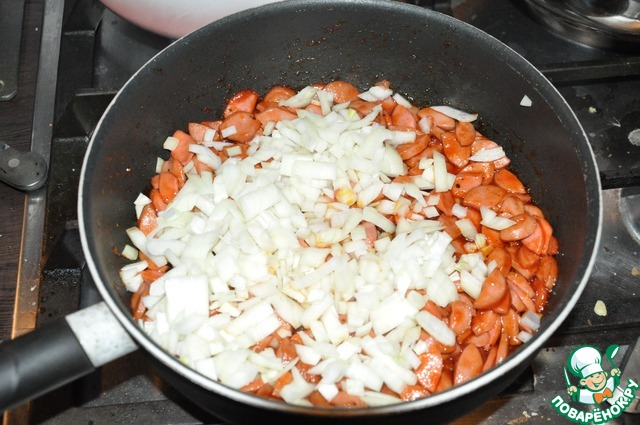 Добавляем лук. Лук можно вообще последним шагом, что он не сварился и остался с хрусточком. Либо его первым делом перед сосисками, если хотите его в жареном виде.