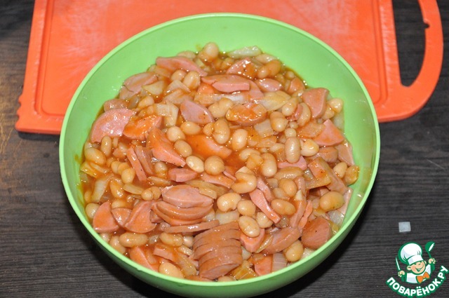 Добавляем фасоль. Белая в томатном соусе. Можете свой вариант. Можно и просто вареную фасоль.