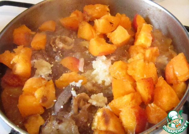 К готовому мясо добавьте нарезанные абрикосы, соль и натертый чеснок. Потушите под крышкой минут 5-7 и влейте уксус.