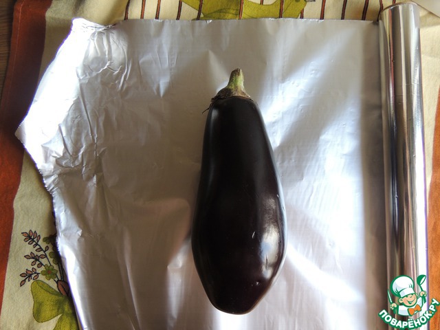 В моей семье не любят кожицу от баклажан, так как она несмотря на обработку всегда остается достаточно жесткой. Поэтому я придумала для такого блюда следующее- сначала нужно обернуть каждый баклажан в фольгу и положить в духовку запекаться на 45-50 минут. Вспомним мы про наши баклажаны только по прошествии указанного времени, а пока займемся начинкой.