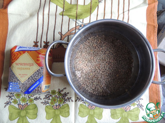 Второй компонент начинки Чечевица. Я выбрала чечевицу Мистраль Пардина. Она имеет характерный ореховый вкус и идеальна в сочетании с рисом. Всыпать чечевицу в кастрюлю в соотношении 1;2 и варить минут 20 до готовности. Чечевицу не нужно предварительно замачивать и этого времени будет вполне достаточно. Слить оставшуюся воду.