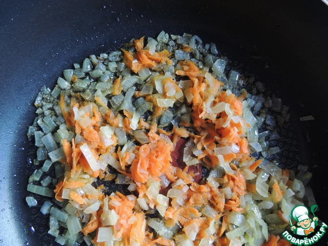 Мелко нарезать лук и морковку. Все обжарить на оливковом масле до прозрачности.