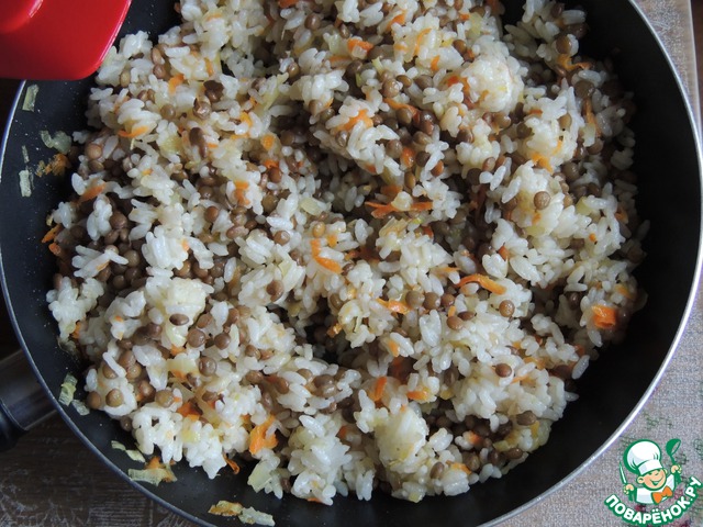 Добавить сваренный рис и чечевицу в сковородку к морковке и луку. Все перемешать и потушить под крышкой еще минут 5. Тогда все ингредиенты соединят свои вкусы.