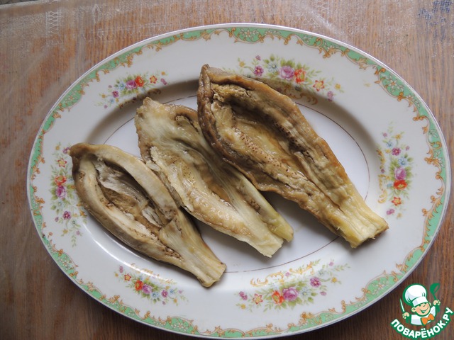 Достать баклажаны из духовки. Аккуратно развернуть фольгу и снять кожицу. Полученные "лодочки" выложить на тарелку. Сделать углубления для начинки.