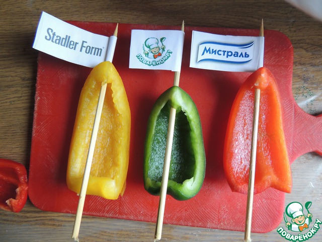 Вырезать из сладкого перца дольки. Одеть их на шампуры как паруса.