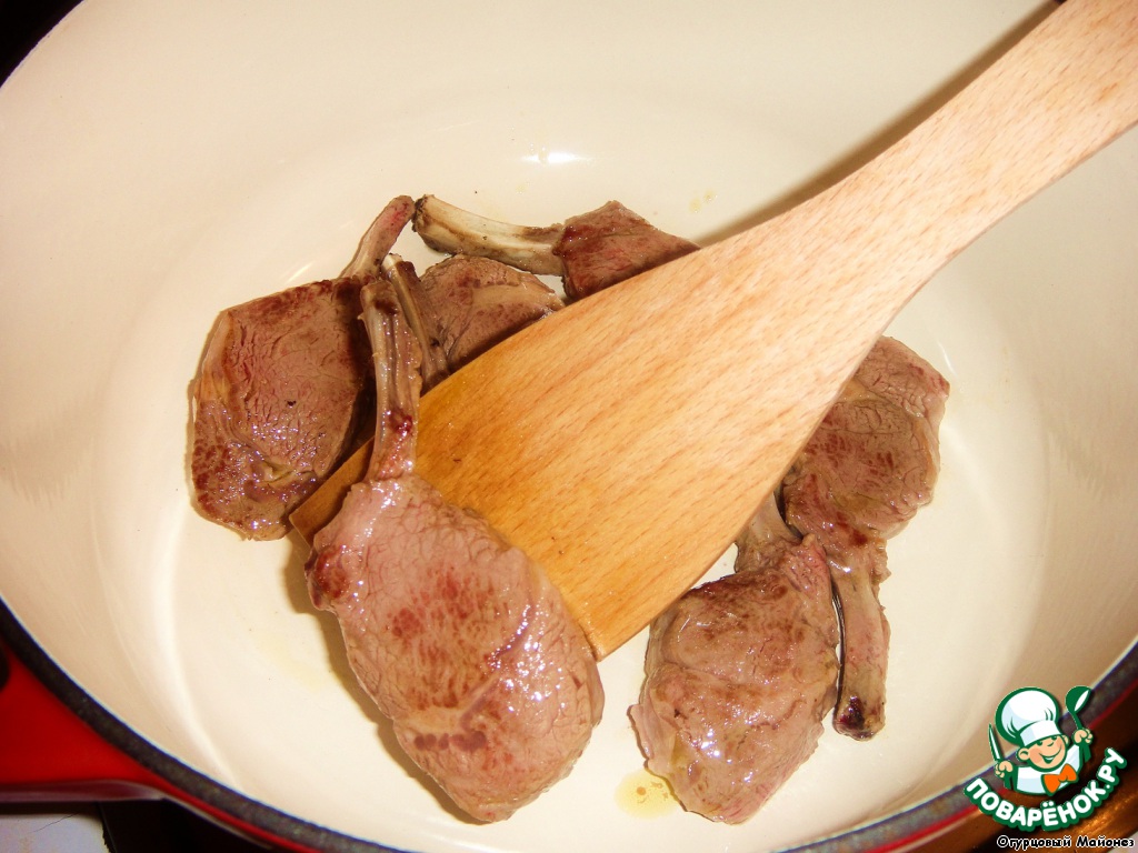 Обжариваем баранину на растительном масле. Сковорода должна быть разогрета очень сильно. Учтите, что прожаривать мясо не нужно. Мы должны лишь создать румянец на боках.