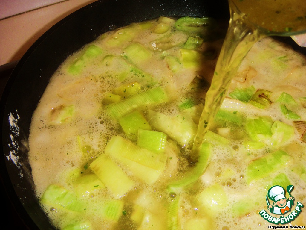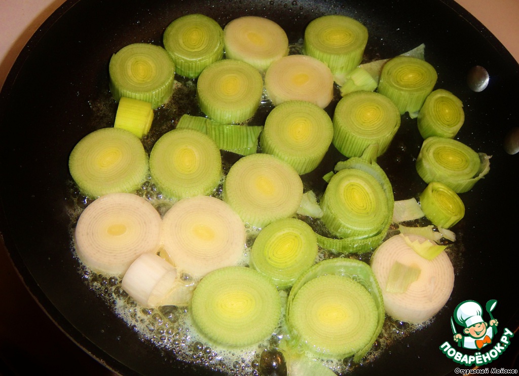 Теперь очередь лука-порея. Растапливаем на сковороде сливочное масло и высыпаем порей, нарезанный крупными кольцами.