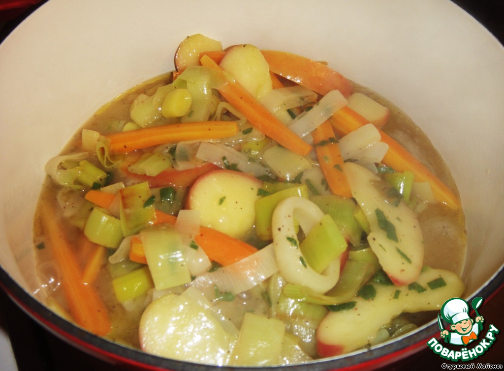 Очищаем яблоко от сердцевины и нарезаем ломтиками. Выкладываем его к овощам на сковороде.
