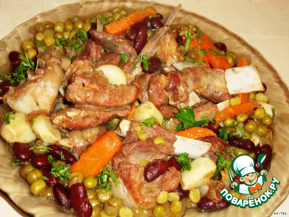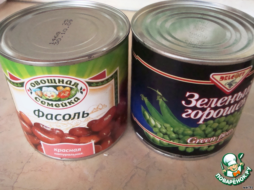 Когда мясо протушилось, выкладываем горошек и фасоль. Накрываем крышкой и еще минут 10-15 тушим.