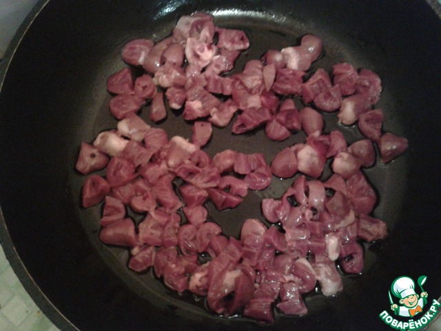 Мелко нарезаем сердечки и обжариваем на сильном огне. Когда они будет готовы добавляем к ним ложку с горкой муки и тщательно перемешиваем, чтоб не было комочков.