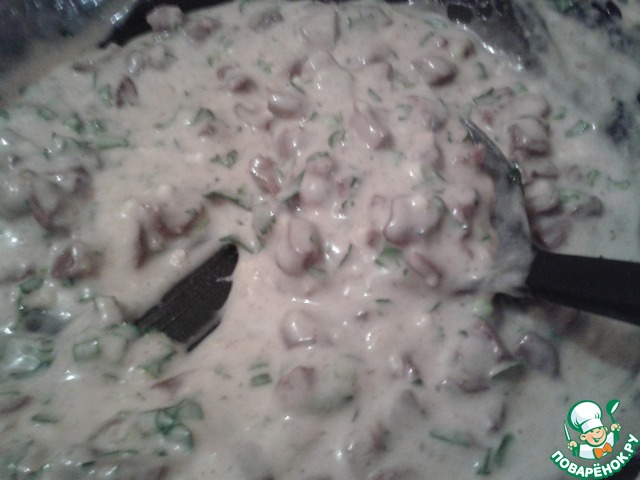 Добавляем туда сметану. Далее добавляем примерно пол стакана воды и перемешиваем. Солим. Получается вот такой подлив.