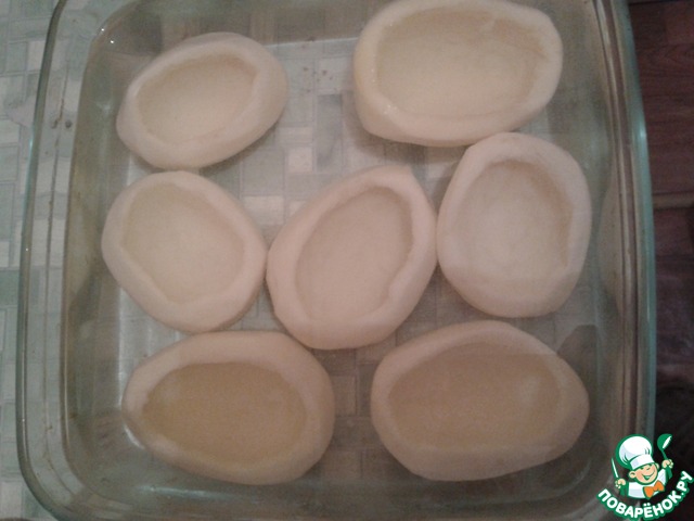 Из сырого картофеля вырезаем серединку, стенки стараемся оставлять как можно тоньше. И кладем в воду.