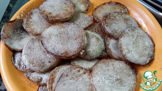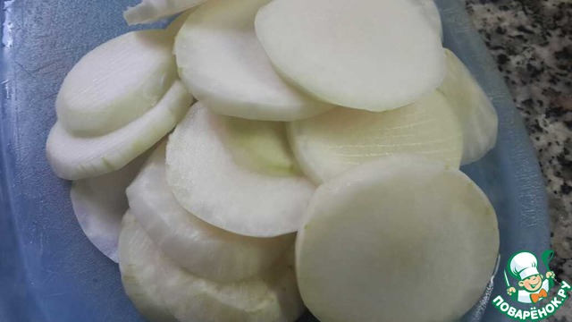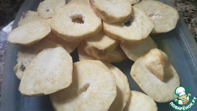 Кольраби нарезать пластинками, толщиной 1/2см. примерно.