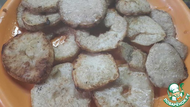 На сливочном масле обжарить корень сельдерея, до румяности, посолить поперчить. положить в отдельную тарелку.