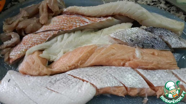 Нарезать рыбу полосками в 2 пальца примерно. если у вас рыба со шкуркой (как у меня)-на шкурке сделать насечки.