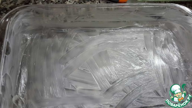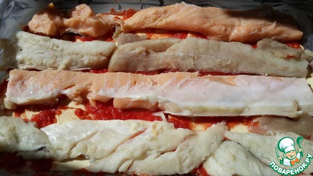 Выложить горизонтальные полоски рыбы, с зазором между полосками. если у вас остатки рыбы кусочками, уложить их в сплошную полосу. если рыба разная, чередуйте виды рыб.