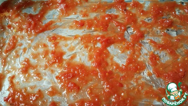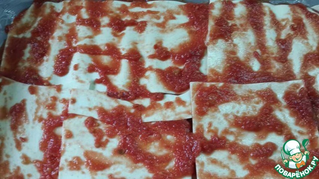 Сформировать первый слой. Положить листы лазаньи и на них ещё немного помидорного соуса