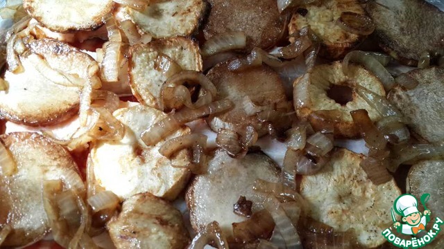 Выложить попеременно вертикальные полосы жаренных кольраби и корня сельдерея, посыпать жаренным луком