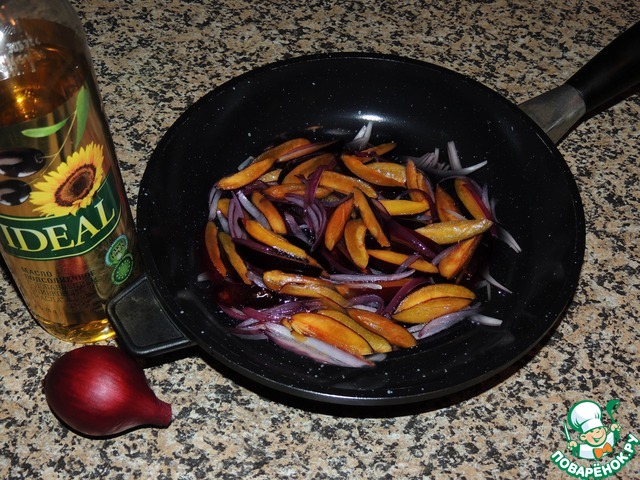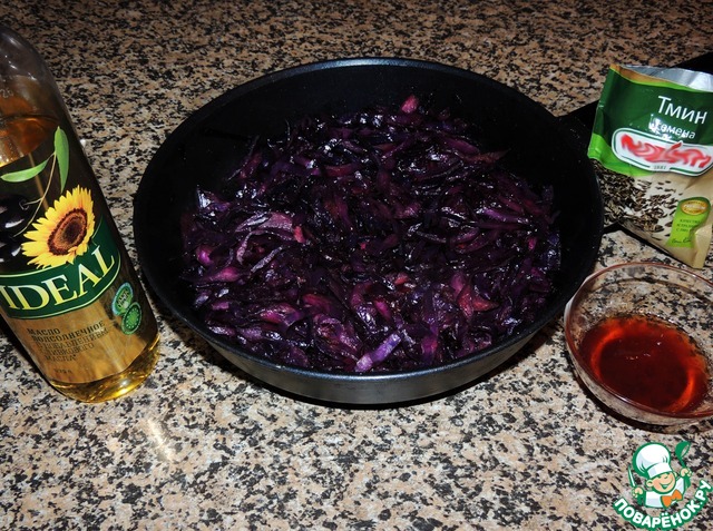 Потушить под крышкой 10-15 минут на растительном масле (я использовала 3 ст. ложки подсолнечного с добавлением оливкового ТМ "IDEAL"). Посолить по вкусу, добавить тмин и красносмородиновое желе (подойдет любое кисловатое).