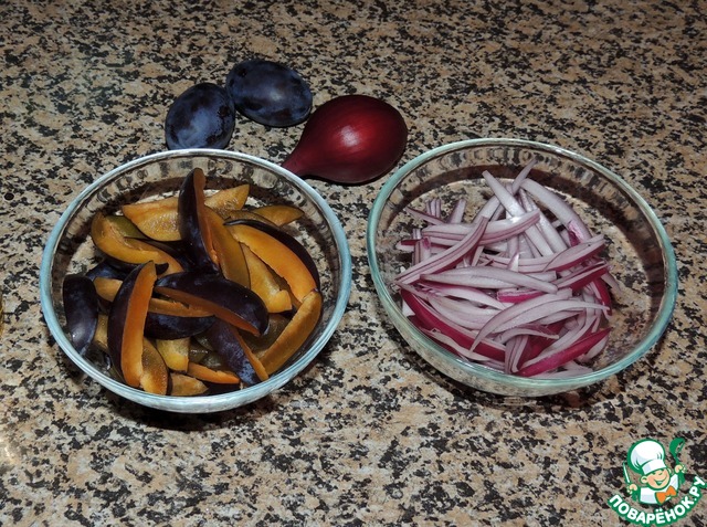 Пока тушится капуста, лук нарезать перьями, сливы - дольками.