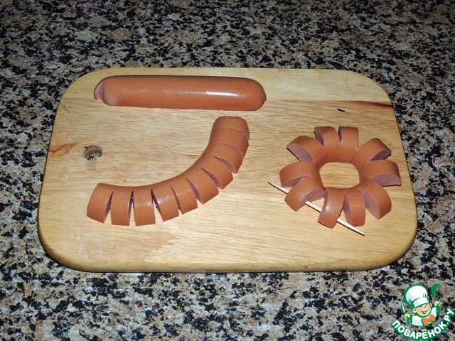 Сосиски разрезать вдоль пополам. Сделать поперечные надрезы, соединить в кольцо и скрепить зубочисткой.