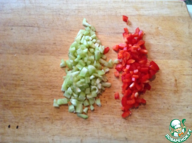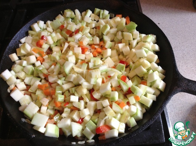 Затем добавить перец и кабачок. Посолить, помешивая обжарить 2-3 мин.