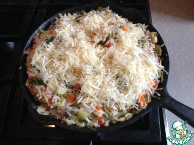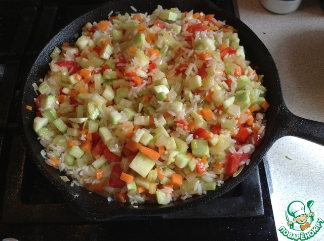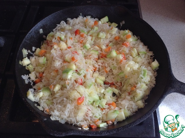 Отложить половину овощей и в оставшиеся овощи засыпать промытый рис. Обжарить 5 мин, помешивая, до испарения влаги. Рис должен остаться с косточкой.