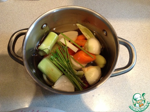 Овощи сложить в кастрюлю и залить 1 л холодной воды, когда вода закипит добавить перец и лавровый лист. Варить на медленном огне 40 мин. Бульон процедить.