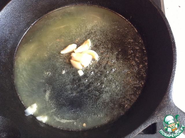 В сковороде с толстым дном разогреть оливковое и сливочное масло. Добавить чеснок и обжарить до золотистой корочки. Чеснок удалить.