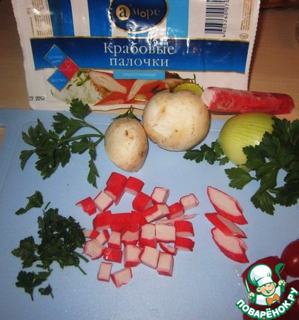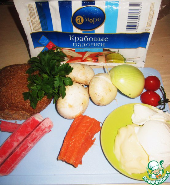 | Сюрприз в булочке прекрасно подойдет для завтрака, или перекуса, легкое в приготовление, очень нежное на вкус блюдо. Прекрасное трио из крабовых палочек "А море мио", грибов и семги уместила в себя маленькая булочка |