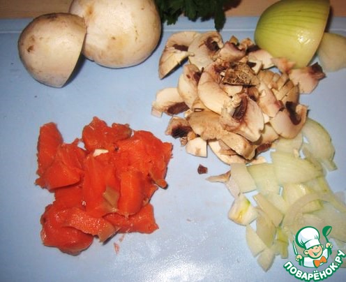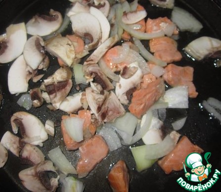 Измельчить грибы, лук. Порезать семгу и отправаить жарить на медленном огне на сковородку, добавив немного растительного масла