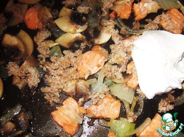 Когда все наши ингредиенты в сковороде будут готовы, добавить к ним ложку сметаны, немного макиша булочки и все хорошо перемешать. Накрыть еще раз крышкой на пару минут и протушить.