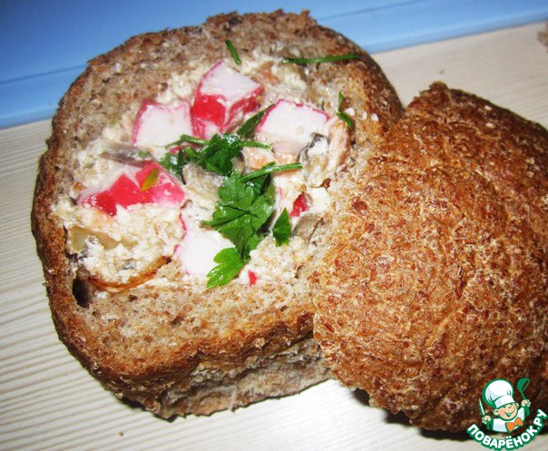Булочку наполнить крабовыми палочками, зеленью и подготовленной смесью из грибов и рыбы