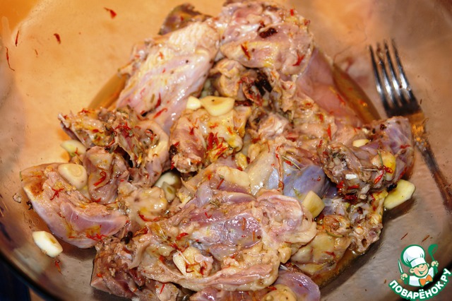 Замаринуйте мясо в специях. Я люблю класть разные травки и экспериментировать со вкусами, но вы можете добавить традиционные для курицы специи. Но неизменным к цесарке должен идти чеснок. Не жалейте, он хорошо подходит. На фото: аналог шафрана (сафлор), иголки розмарина, чеснок, длинный перец, орегано.