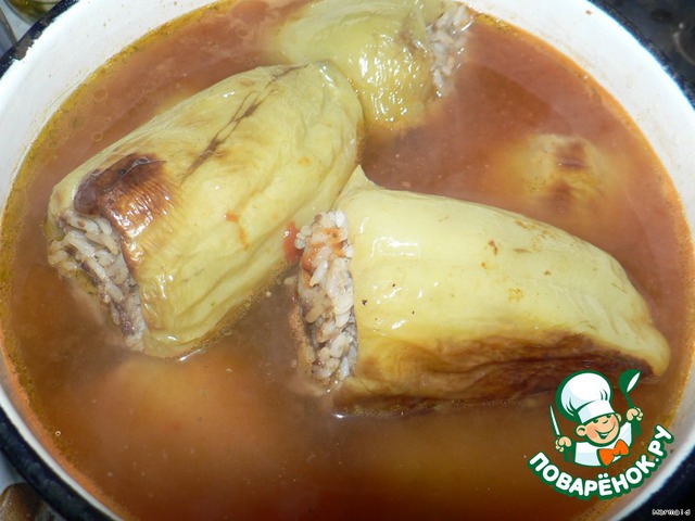 В кипящий бульон сложите все перчики так, чтобы они были покрыты жидкостью. Если не хватает бульона, добавьте воды.