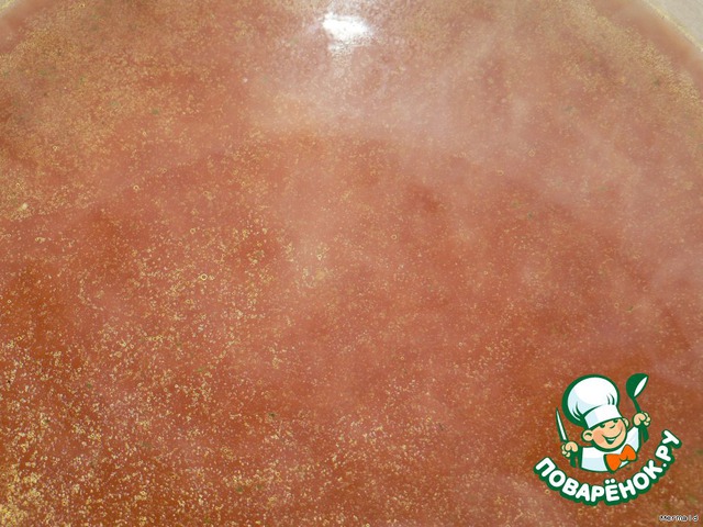 Сделайте томатный бульон - в кастрюлю или латку налейте воды (примерно 2 литра), бросьте туда 3 бульонных кубика (я беру с беконом и зеленью), и налейте кетчуп, чтобы бульон был красным и довольно острым. Добавьте соли.