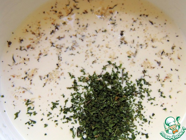 Для соуса соединяем сливки и молоко, добавляем муку, петрушку, солим и перчим. Всё хорошенько перемешиваем.