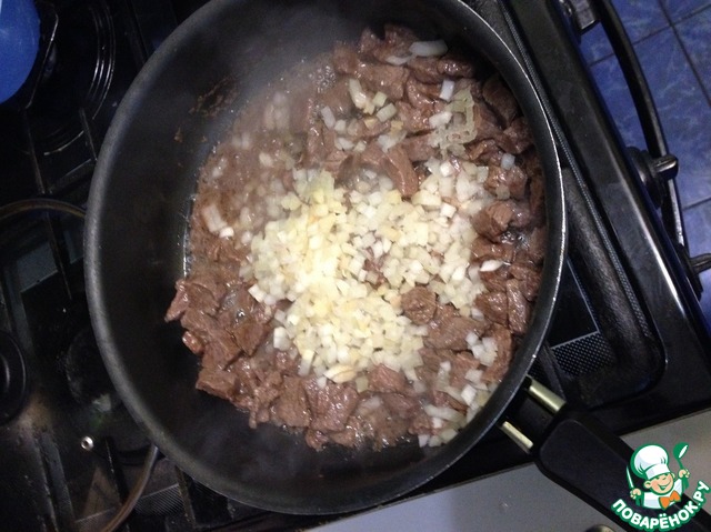 Когда мясо хорошо обжарится, добавить к нему лук и продолжать жарить, пока лук не станет прозрачным.