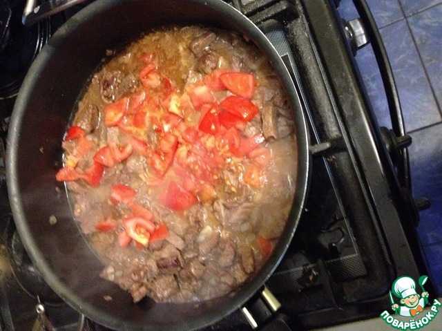 Затем в сотейник отправить вымытые и нарезанные небольшими кубиками помидоры. Тушить еще 5-10 мин.