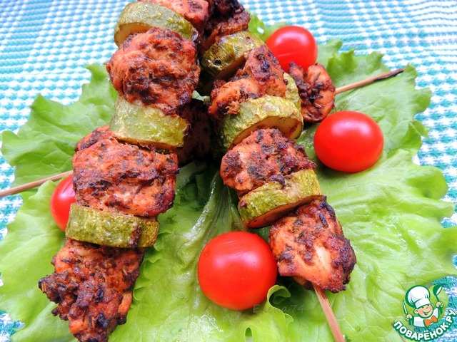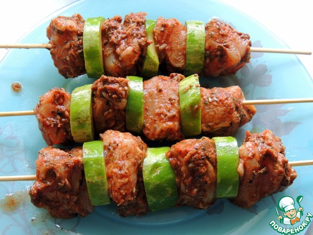 Одеваем кусочки мяса чередуя с овощами на шпажки (замоченные в воде на пол часа) или шампура.